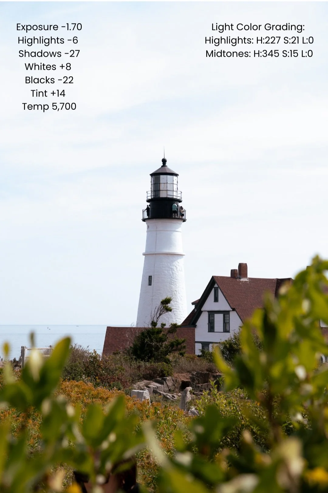 I primary focused on the rule of thirds and placing my subject, the lighthouse in the center of the frame. Photography is about eliciting a feeling and telling a story. I wanted the lighthouse (a Maine icon) to be the focal point and stand out in this image. By placing it in the center, it brings the viewers eye to it.